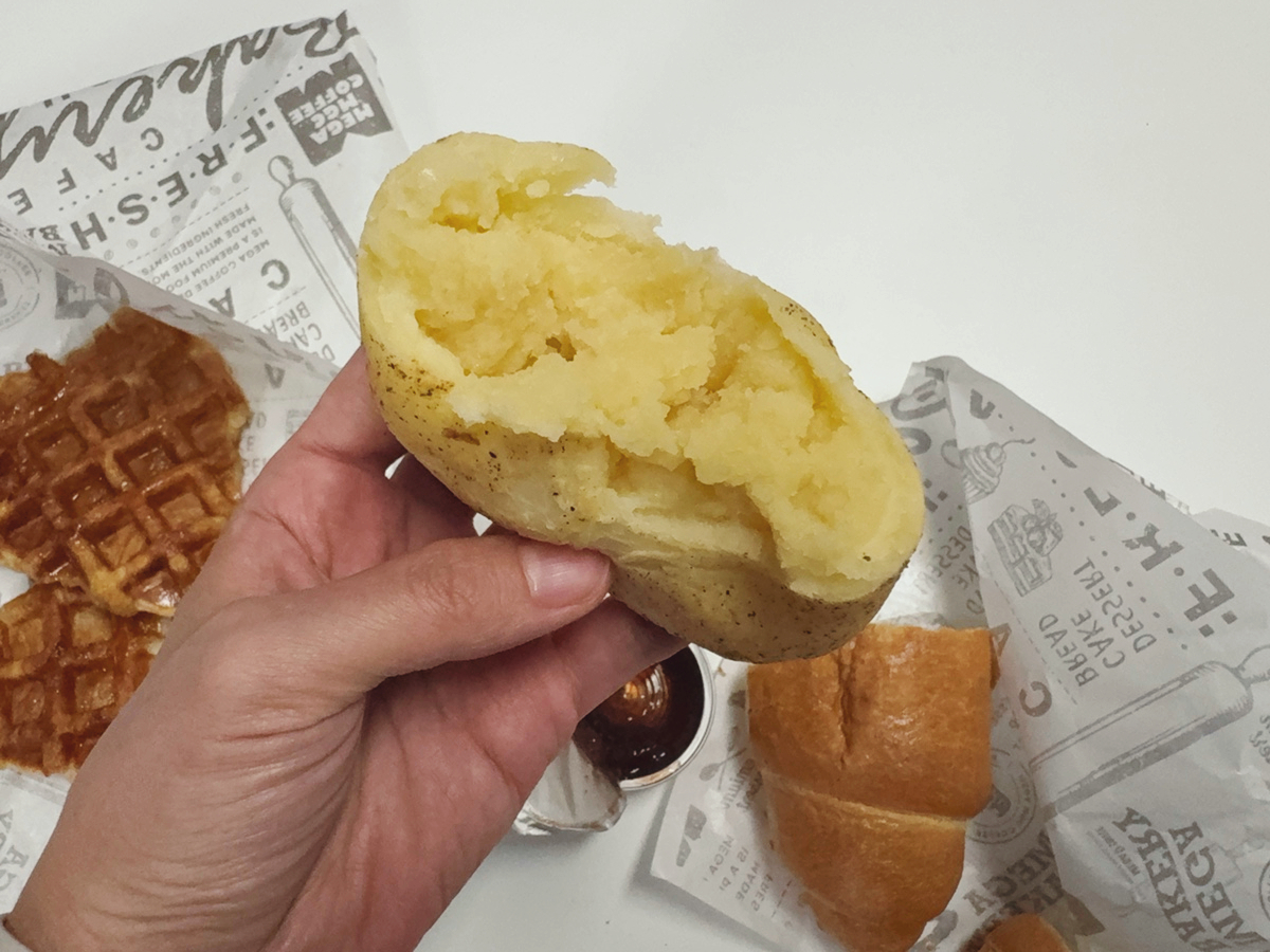 제가 방문한 매장은 가양동에 있는 강서한강자이타워점인데 갓 구운 감자빵을 받을 수 있었는데, 따뜻한 상태로 먹으니 속이 더욱 촉촉하고 부드러웠습니다. 바삭한 겉면과 감자 속의 조화가 생각보다 잘 어울렸으며, 버터 향과 함께 은은한 단맛이 감돌았습니다.