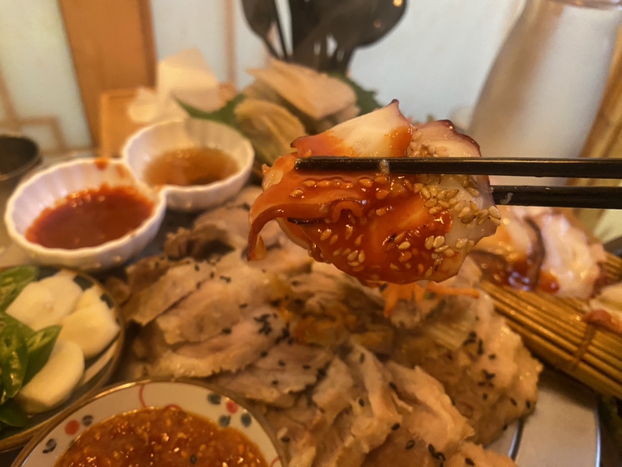 ✔ 상수 문어 보쌈 (₩30,000) – 일반적인 보쌈과 달리 문어가 함께 제공되어 색다른 조합을 맛볼 수 있어요. 돼지고기는 잡내 없이 부드럽게 삶아져 있고, 문어는 쫄깃한 식감이 살아 있어요. 곁들여 나오는 묵은지와 무말랭이 무침을 함께 싸서 먹으면 감칠맛이 더욱 극대화돼요.