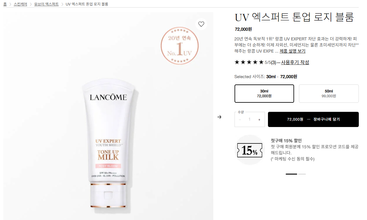 가격대별로 추천 제품을 살펴보면, 중저가형에서는 미샤 올어라운드 세이프 블록(약 15,000원)이 SPF 45/PA+++로 가성비가 뛰어나며 라로슈포제 안뗄리오스 유브이뮨 400 하이드레이팅 크림 (약 35,000원)이 민감성 피부에도 안전한 물리적 차단제로 인기가 높습니다. 고가형에서는 랑콤 UV 엑스퍼트(약 72,000원)가 SPF 50+/PA++++로 최고 등급의 차단력과 우수한 발림성을 자랑합니다.