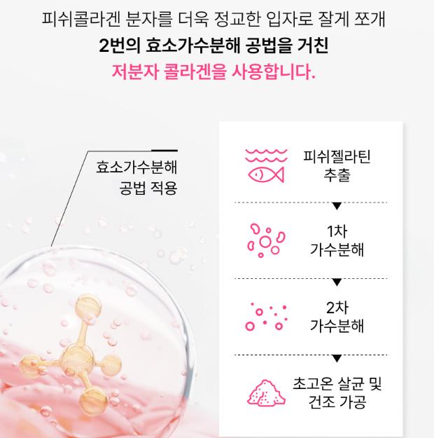 분자량이 작을수록 우리 몸의 흡수율이 높아집니다. 실제로 일반 콜라겐은 분자량이 커서 인체에 제대로 소화 흡수되지 않고 90% 이상이 그대로 배출된다고 알려져 있어요.