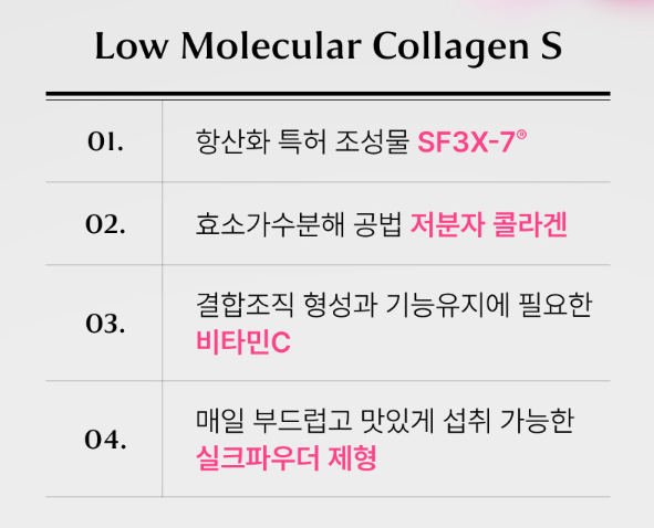 • 저분자 콜라겐 펩타이드: 평균 분자량 400달톤