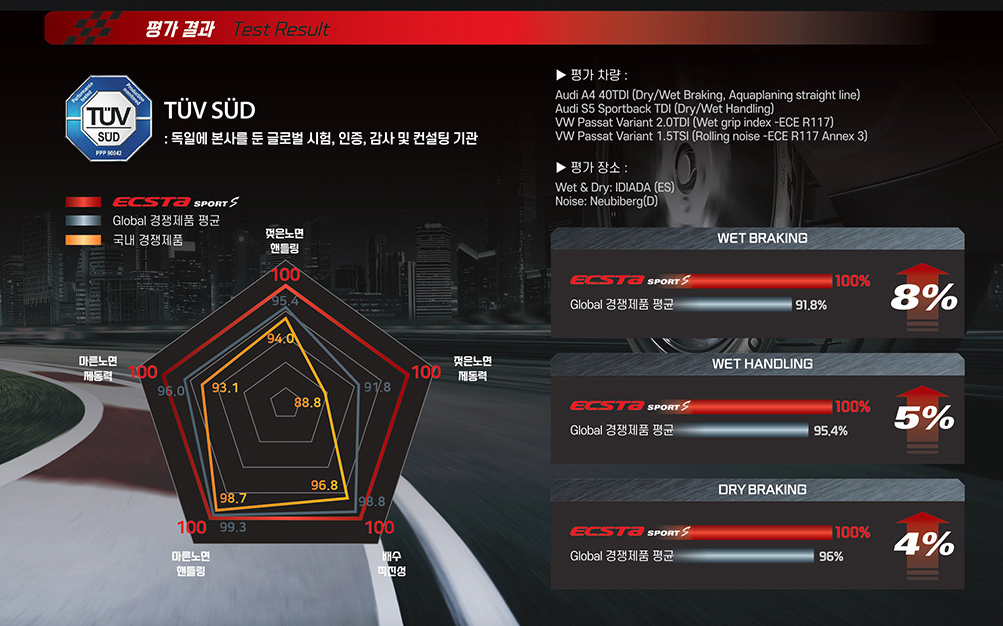 출처: 금호타이어 홈페이지 금호타이어의 최대 강점은 뛰어난 가성비와 조용한 주행감입니다. 동급 대비 10-20% 저렴한 가격으로 우수한 정숙성을 제공하며, 국내 기후와 도로 환경을 고려한 특화 설계로 빗길 제동력과 내마모성이 우수합니다. 또한 컴포트 지향의 부드러운 승차감으로 장거리 운전자들에게 인기가 높습니다.