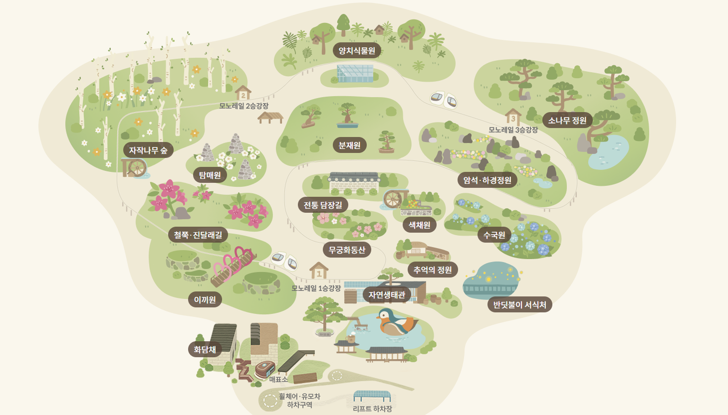 출처: 화담숲 홈페이지 화담숲을 방문할 때 가장 놓쳐서는 안 될 인기 코스 중 하나는 모노레일이다. 화담숲의 모노레일은 가파른 경사를 오르기 힘든 방문객들을 위해 운영되며, 정상까지 편안하게 이동할 수 있다. 모노레일을 타면 한눈에 숲 전체를 조망할 수 있어 더욱 멋진 풍경을 감상할 수 있으며, 특히 가을 단풍 시즌에는 환상적인 풍경이 펼쳐진다. 정상에서 내려다보는 풍경은 사진 명소로도 유명하여, 방문객들은 아름다운 자연을 배경으로 인생 사진을 남기곤 한다.