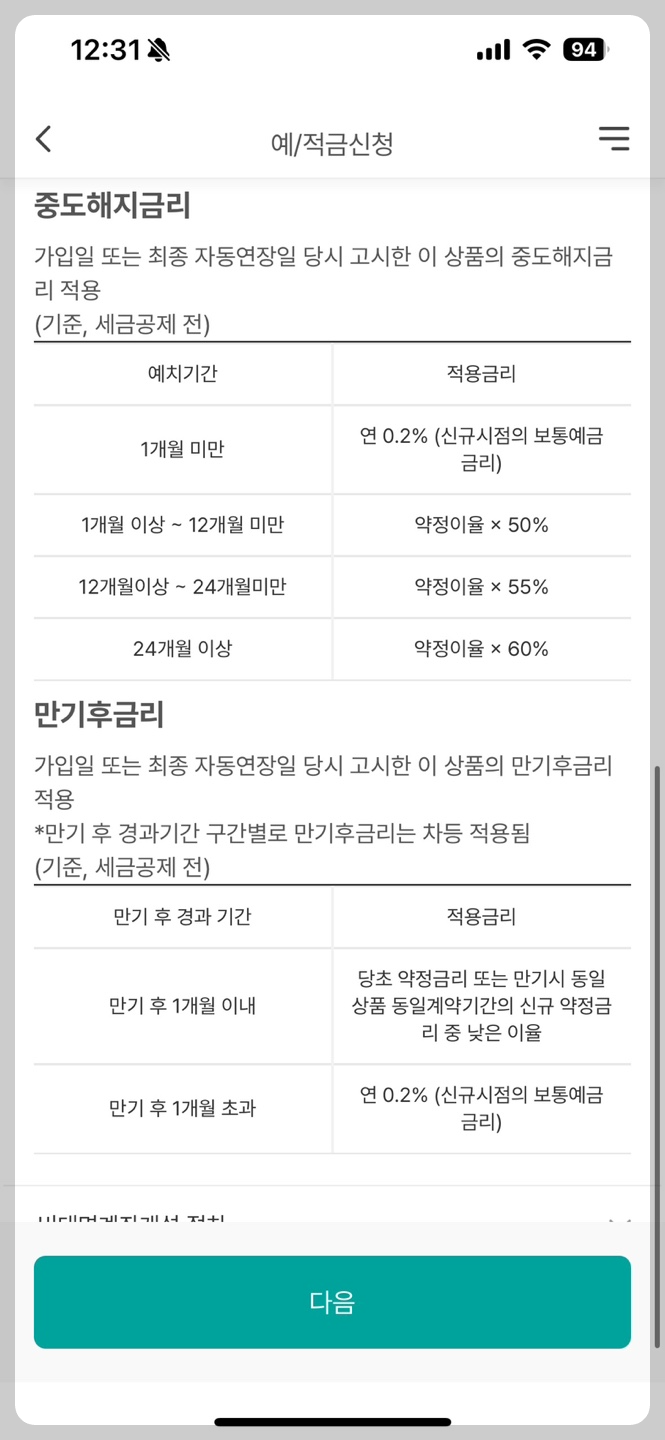 모바일 앱에서 정기 적금 상품들을 자세하게 확인하실 수 있으며 본인의 상황과 목적에 맞는 적금을 찾아 바로 신청이 가능합니다. 특히 적금하는 동안 어떤 상황이 발생할지 모르기 때문에 중도해지금리도 꼼꼼하게 살펴봐야 합니다.